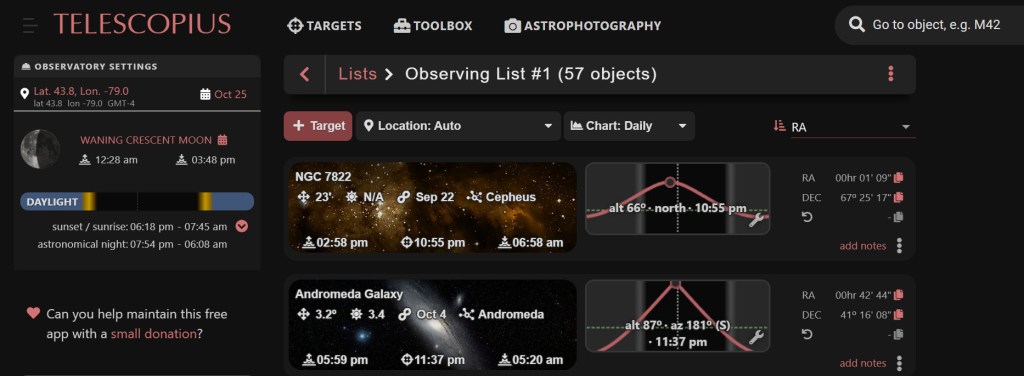 You can also enjoy the hobby on your own or directly with other enthusiasts. You can be part of in-person clubs or online forums to share questions and ideas. You engage in the hobby after the sun sets, when all of your other obligations to family are done for the day, so that nothing else intervenes. That peaceful night sky with the surrounding quiet of a sleeping residential subdivision where I am the only one awake is very very calming. At least until the night critters show up, which for me includes racoons, possums, rabbits, cats, mice and coyotes. But even that is entertaining.