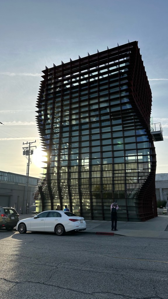 The next day, I met the group for the first time, and we got right to work, heading back into downtown. Downtown has very few old buildings, which surprised me, but we stopped at one to get us started – the Bradbury building. After that, it was all about modern lines, angles, curves, bends. We visited LAPD Headquarters, CalTrans main office and other locations nearby. We then headed to the Cathedral of our Lady of Angels (the largest cathedral in the US apparently), the Ramon C. Cortines School of Visual Arts. We then hopped a shareride to the west, visiting the Museum of Modern Art, Academy Museum of Motion Pictures, a wonderful light installation and the Petersen Automotive Museum for blue hour.