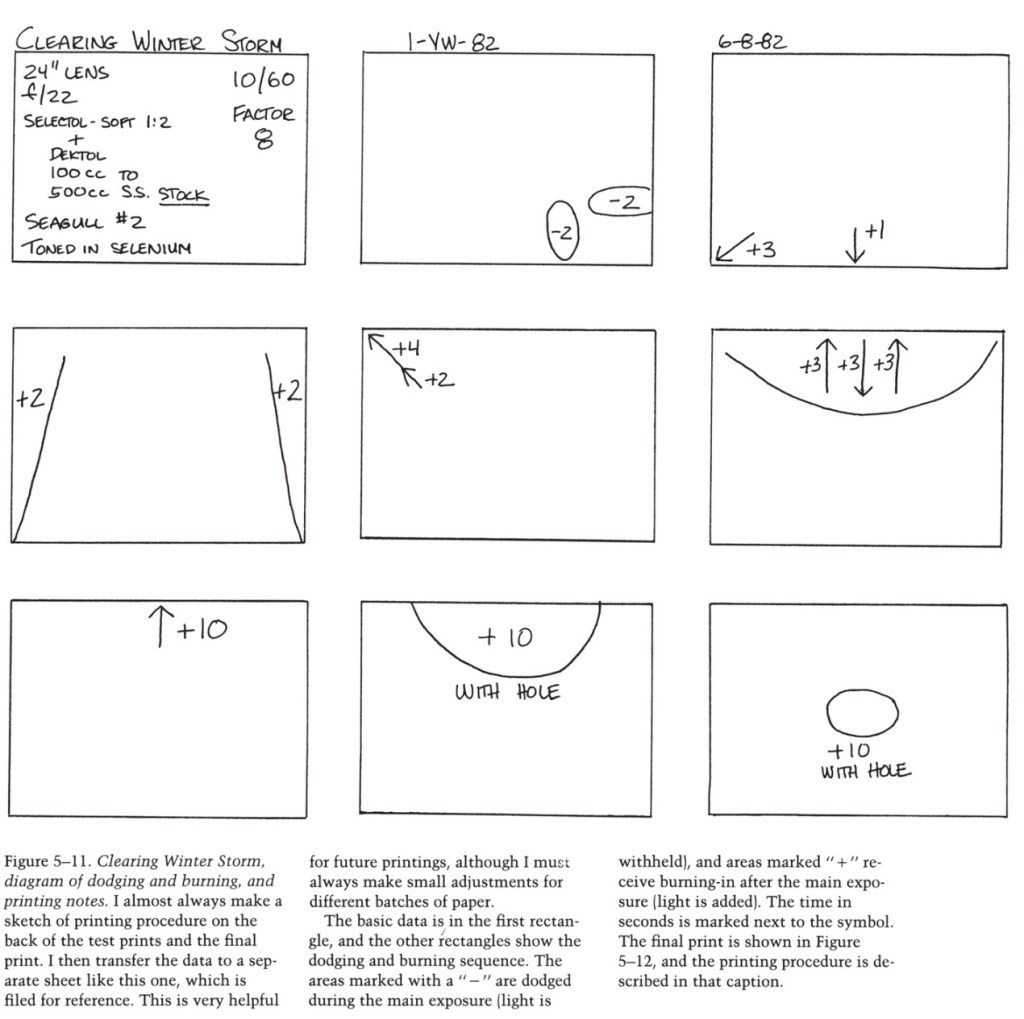 Editing, as mentioned, has been part of the artist’s toolkit almost since the beginning. Yes, you can edit even if you are shooting film. Editing here involves artificial light and chemicals to manage tonal range and colour choices in processing the film. It involves even the paper used in creating a print, and how you let in light through to the paper to create the print. Ansel Adams was my hero in this medium. He shot primarily in black and white, and used many many techniques to achieve a final result, including test prints at different exposures and mapping out exactly what tonal changes he wanted where. One small example is below (click on the photos to read the details):
