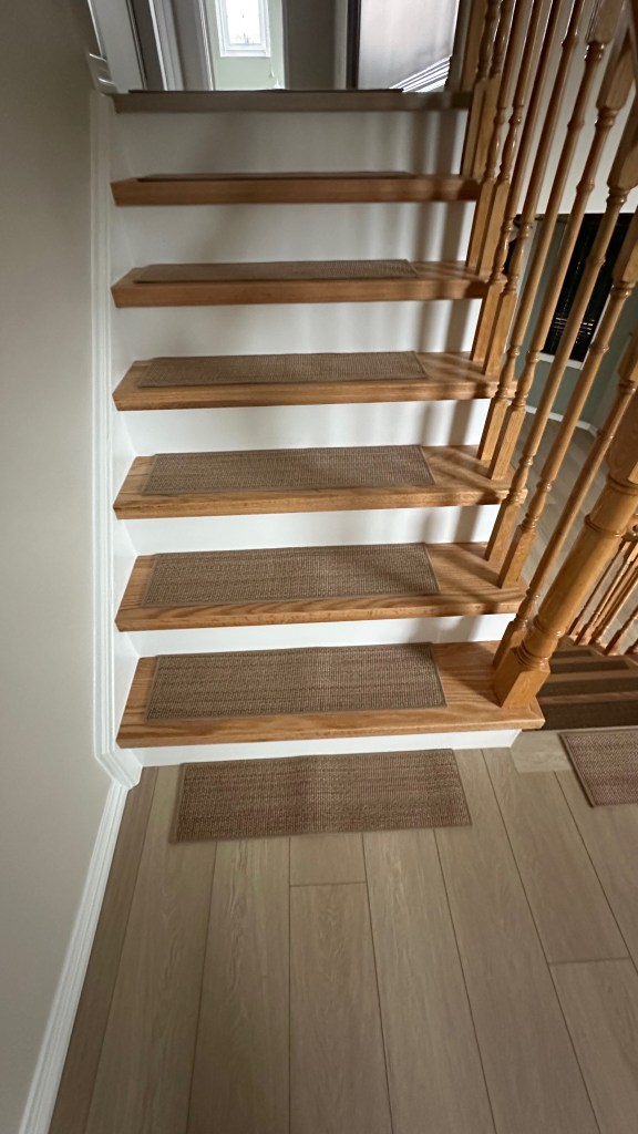 The work took just over 6 weeks, allowing for some time gaps to potentially manage delays. That included moving everything big out of the house or into the basement, removing all the existing wall to wall carpeting and replacing it with the new flooring, and painting every wall and most ceilings. There are always unexpected challenges, like two crew members who separately had to deal with the passing of a parent during my project, or being flexible with the painters so that they could do outdoor projects for other clients on good weather days as long as the overall project window was not affected. It also turns out that my floors and walls have very few straight and level runs and these contractors were masters at handling those issues, but it did extend the timeline for completing the work a bit.